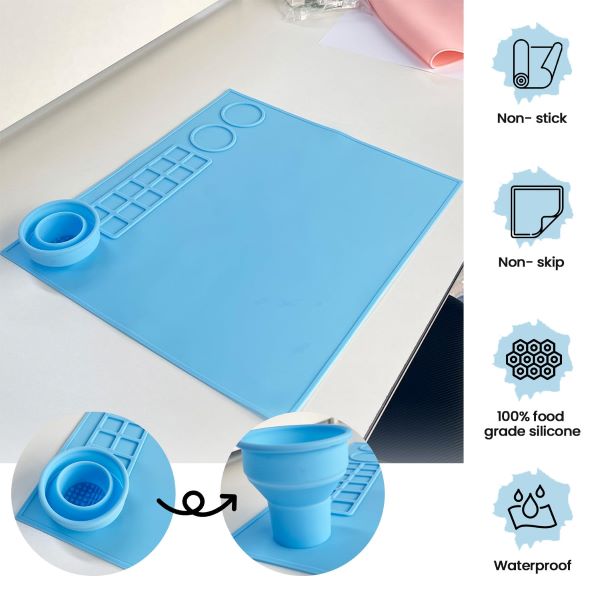 Făcut din silicon de calitate alimentară 100%, acest covoraș impermeabil, non-adeziv și antiderapant este perfect pentru toate nevoile tale de creație. Cu 14 recipiente și o zonă de amestecare, este perfect pentru organizarea materialelor tale.