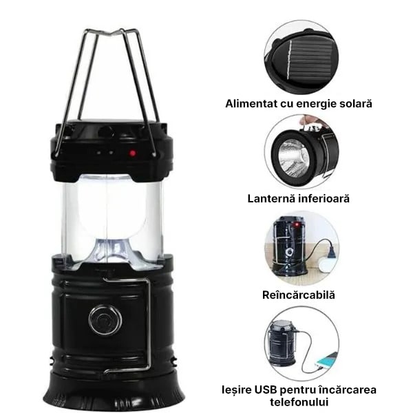 Păstrați lampa încărcată cu două opțiuni convenabile: energie solară și încărcare USB. Celulele solare încorporate în partea superioară a lămpii asigură o încărcare ecologică, în timp ce cablul USB inclus oferă o alternativă rapidă și fiabilă. Această funcționalitate dublă vă asigură că aveți întotdeauna o rezervă, indiferent dacă vă aflați în afara rețelei sau în apropierea unei surse de alimentare.